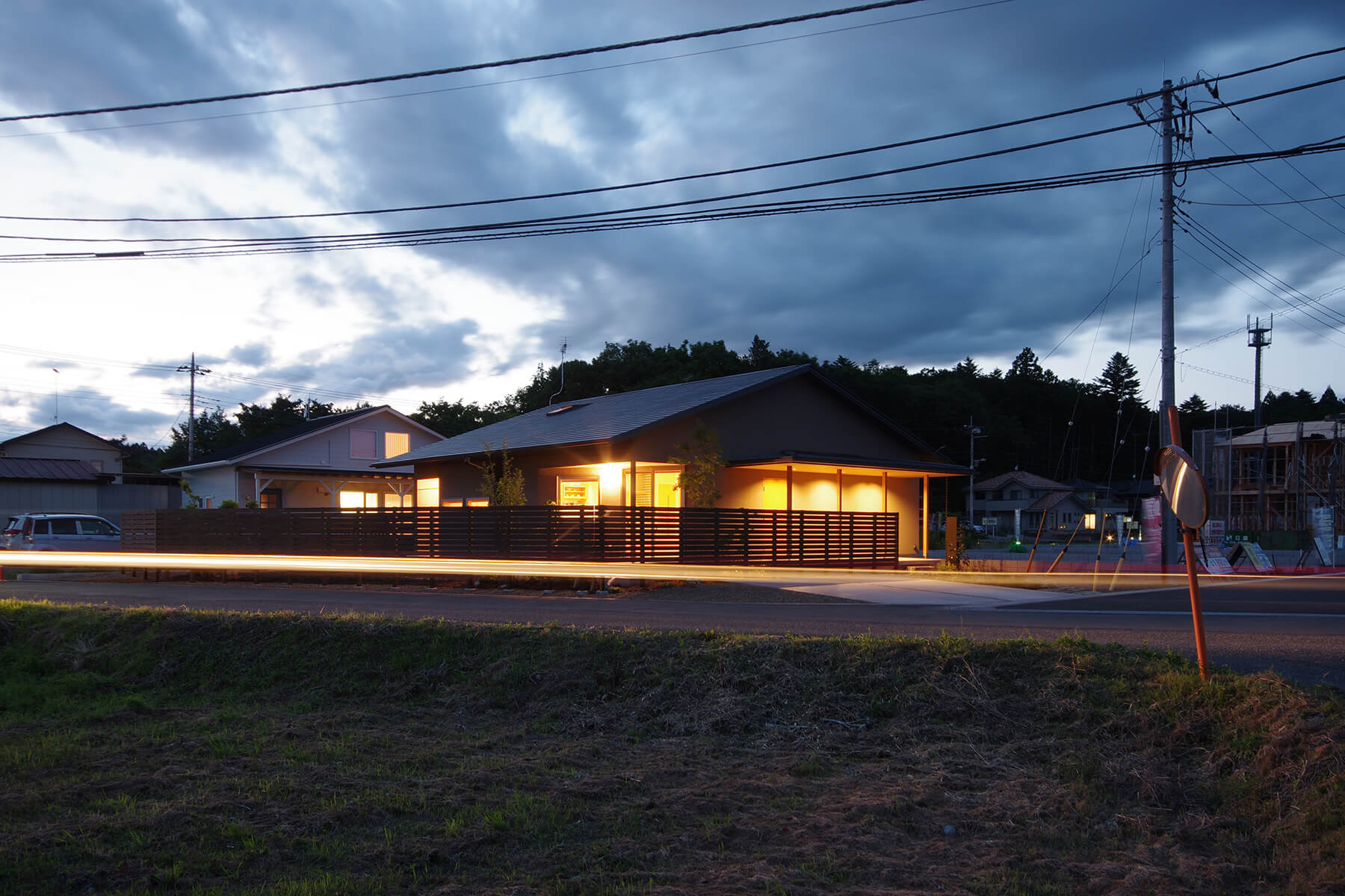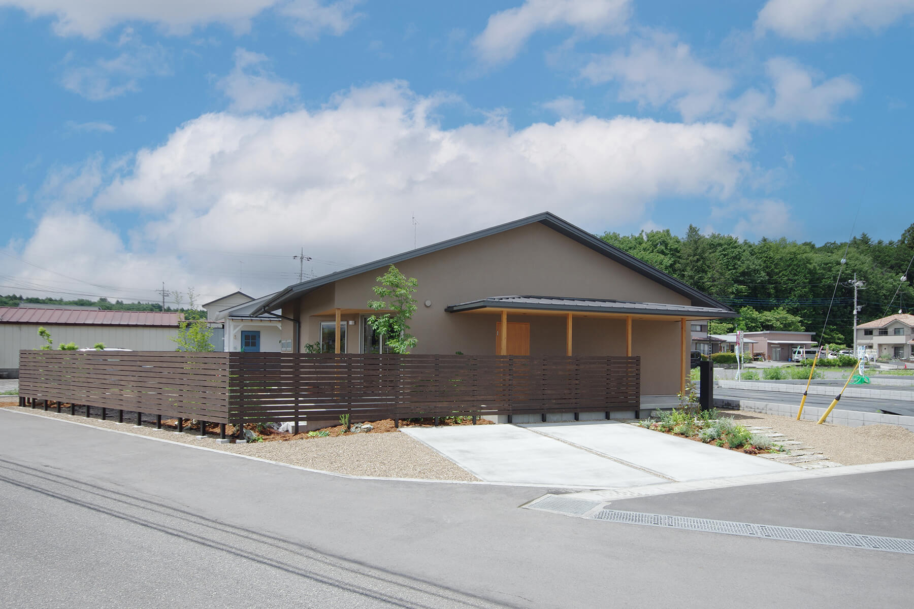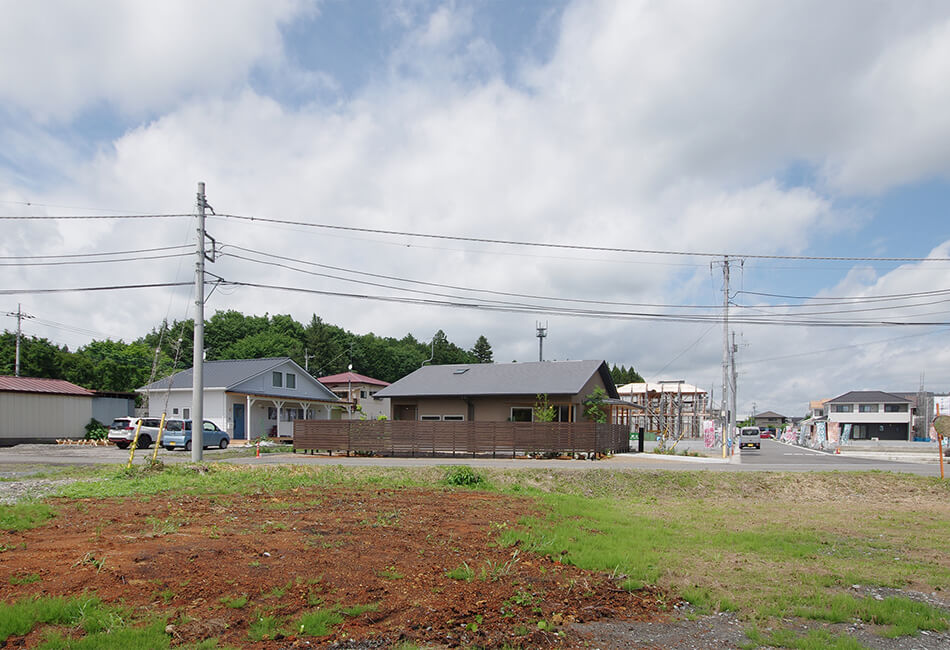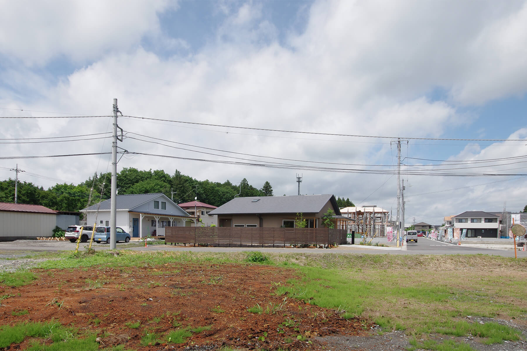 新たに開発された分譲地に建つ平屋の住宅である。この分譲地は比較的広大で全20区画あるが、ここ以外の区画は某建売会社の建物が建ち並ぶ予定である。