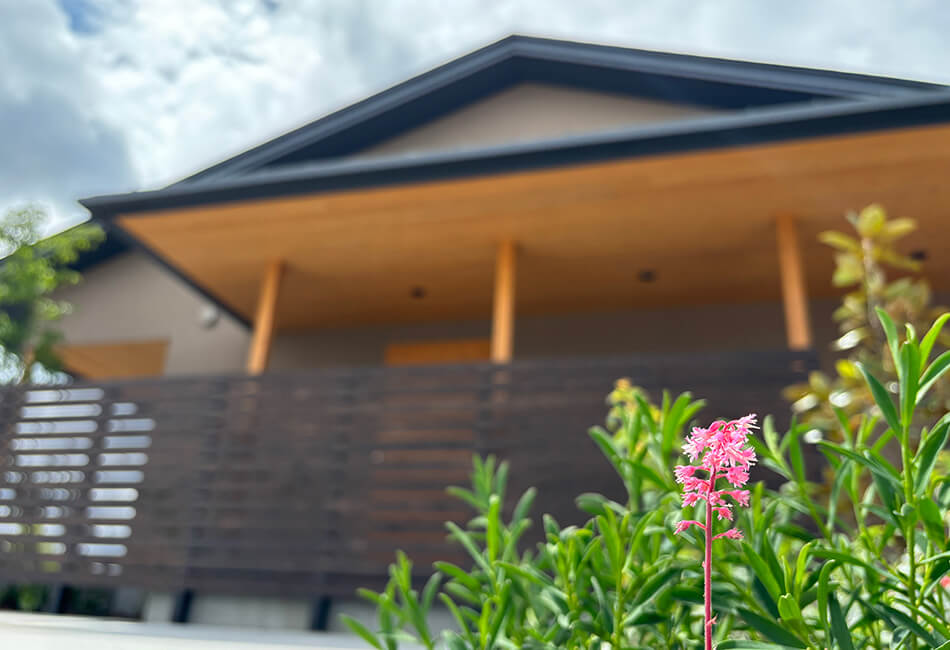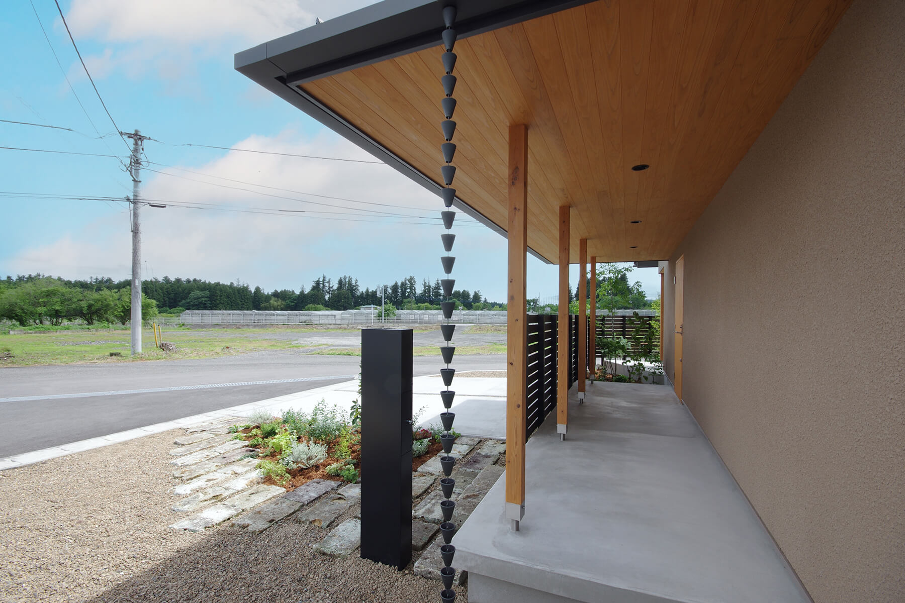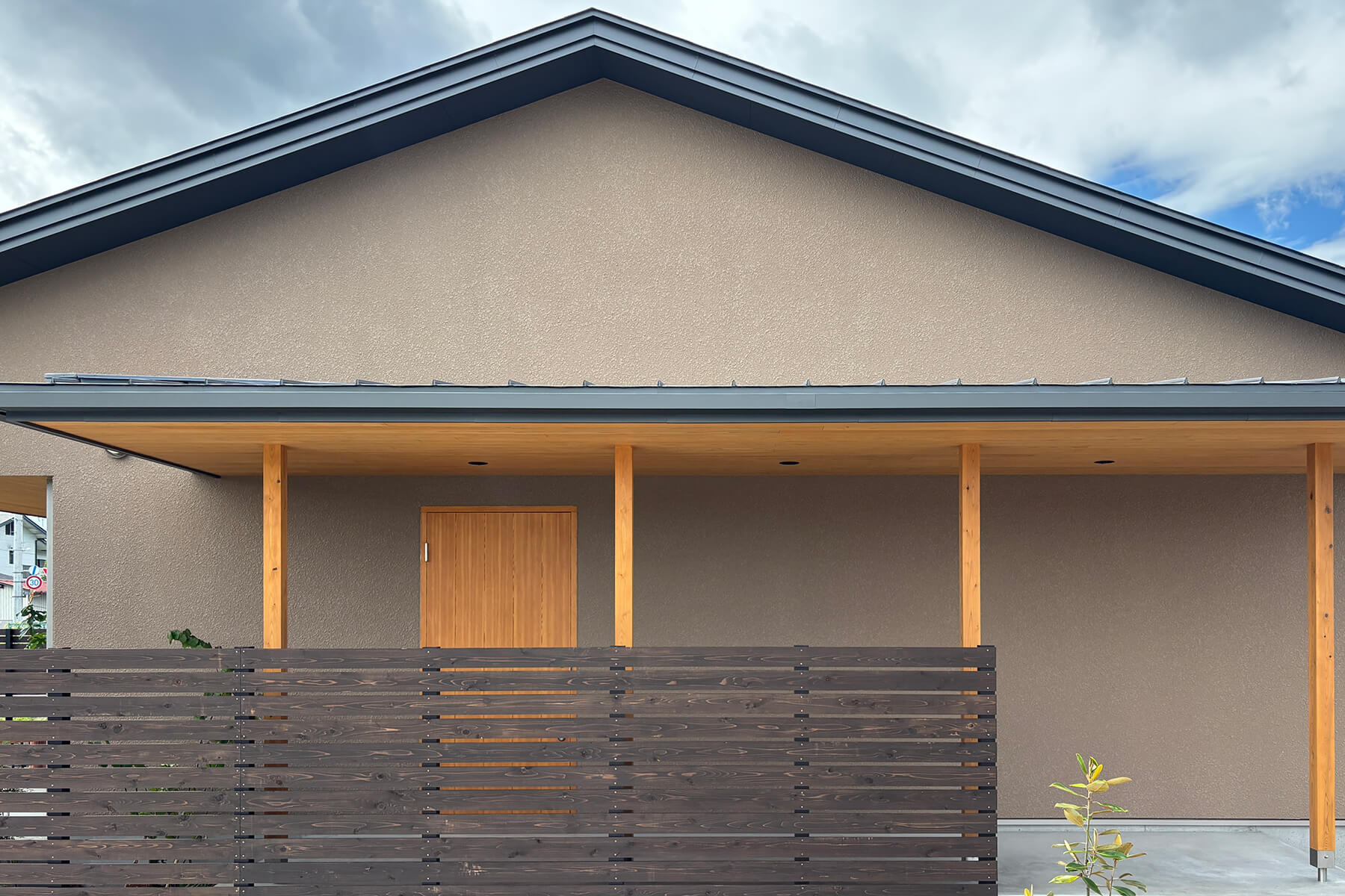建物は正方形に近い矩形の間取りに対して3.5寸の少し緩やかな切妻屋根を掛け、そこに玄関ポーチ部分の下屋を付属させた極めてシンプルな構成となっている。