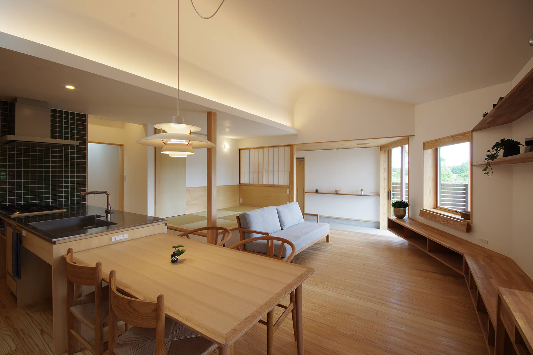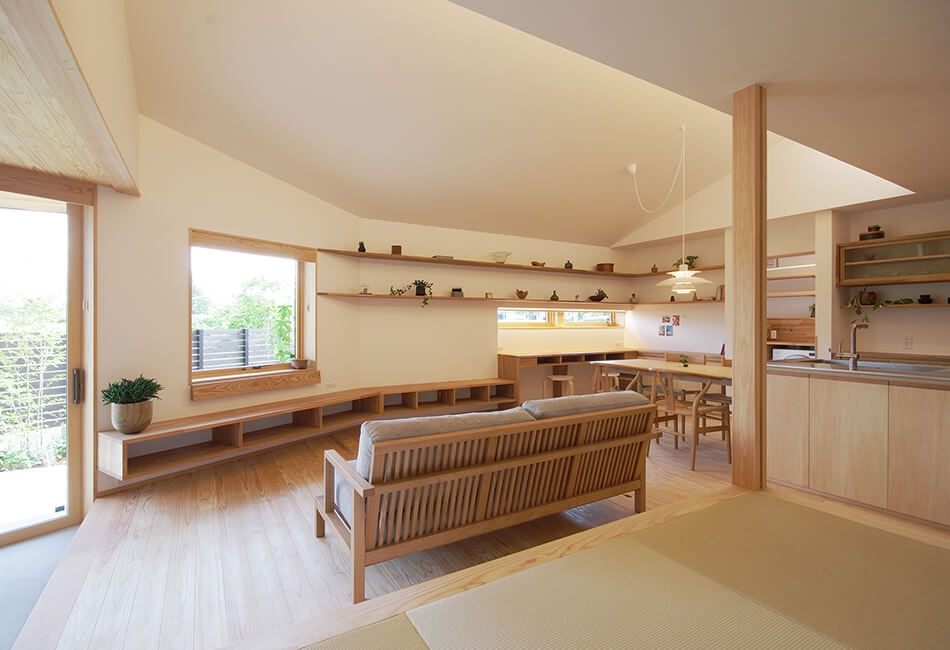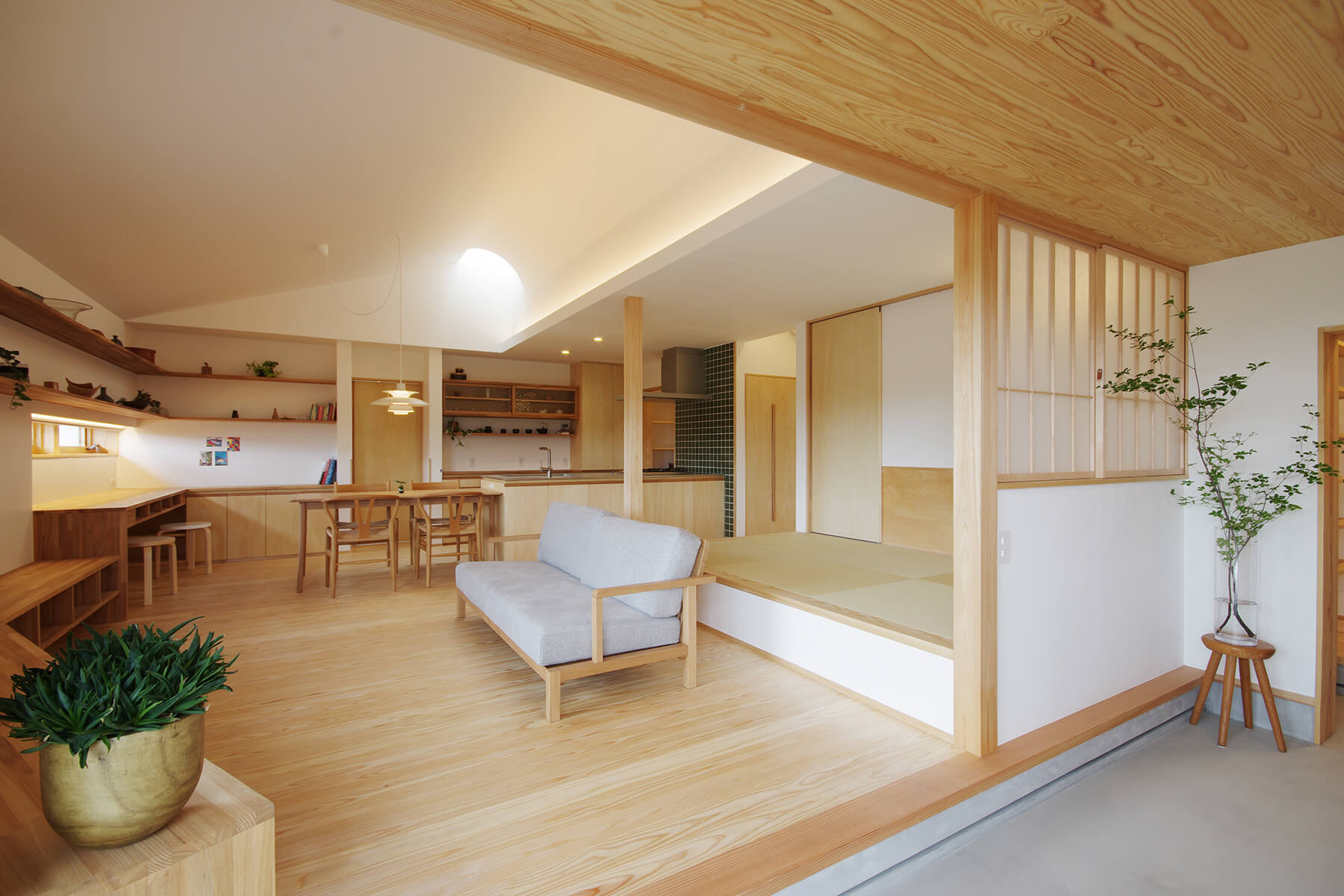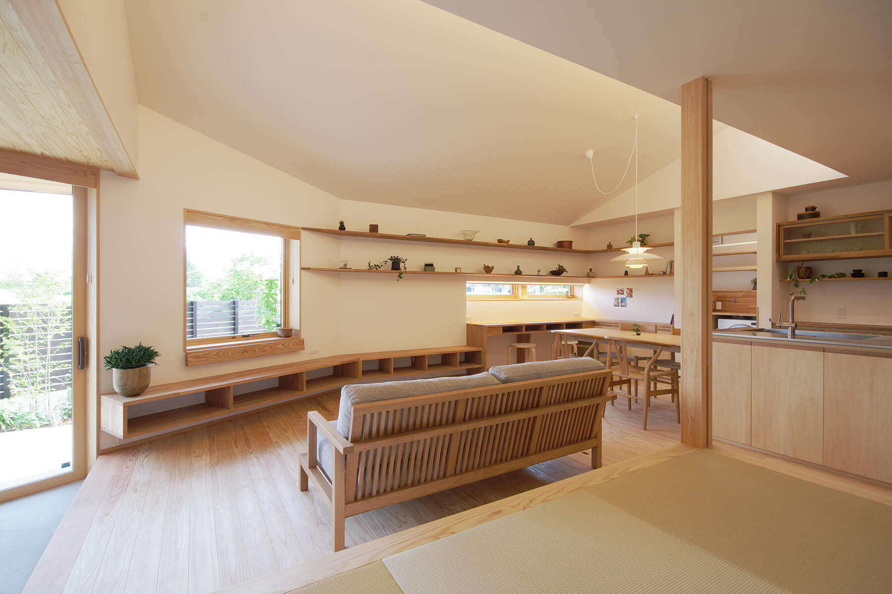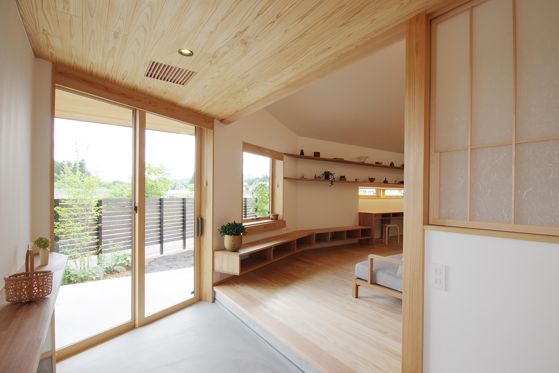 広い内土間から上がると気積が大きな空間が広がる。ここは生活のメインとなる場所でリビングのソファを含めて仕事や子供の宿題ができるスタディコーナー、庭を眺められる窓際のベンチ、昼寝ができる3帖の小上がりの和室など様々な居場所を設けて、家族が思い思いの場所で過ごせる仕掛けを用意した。また、天井と壁の接する部分を曲面にすることで柔らかく包まれる空間を作った。