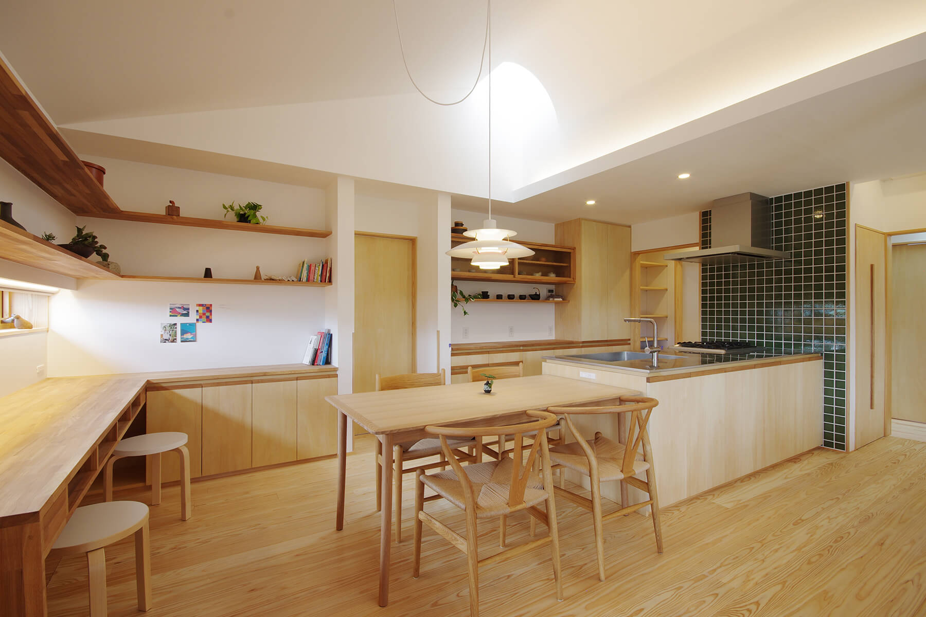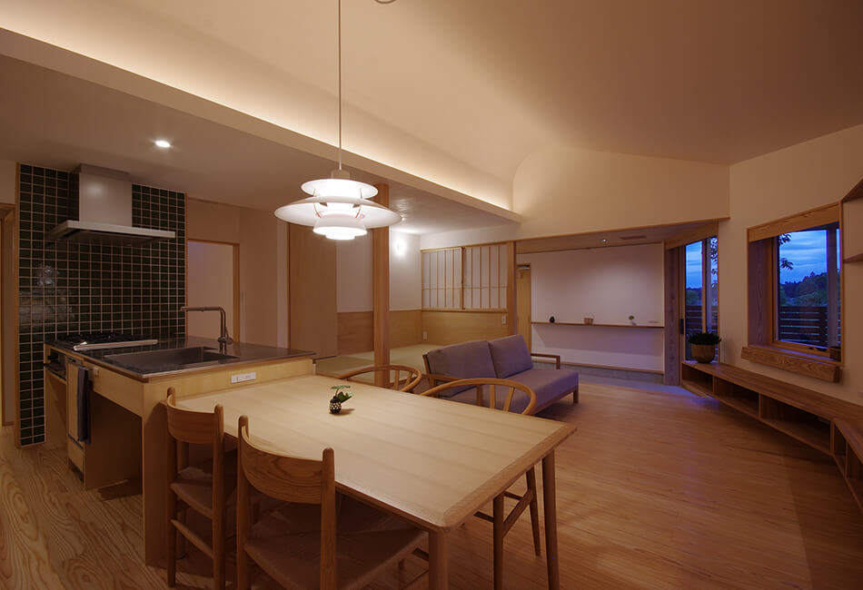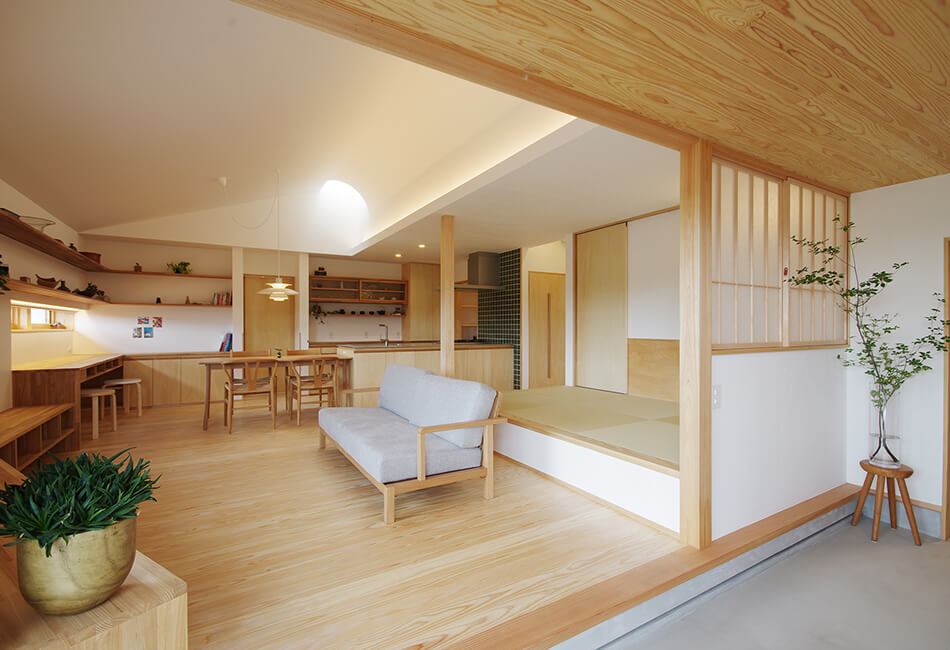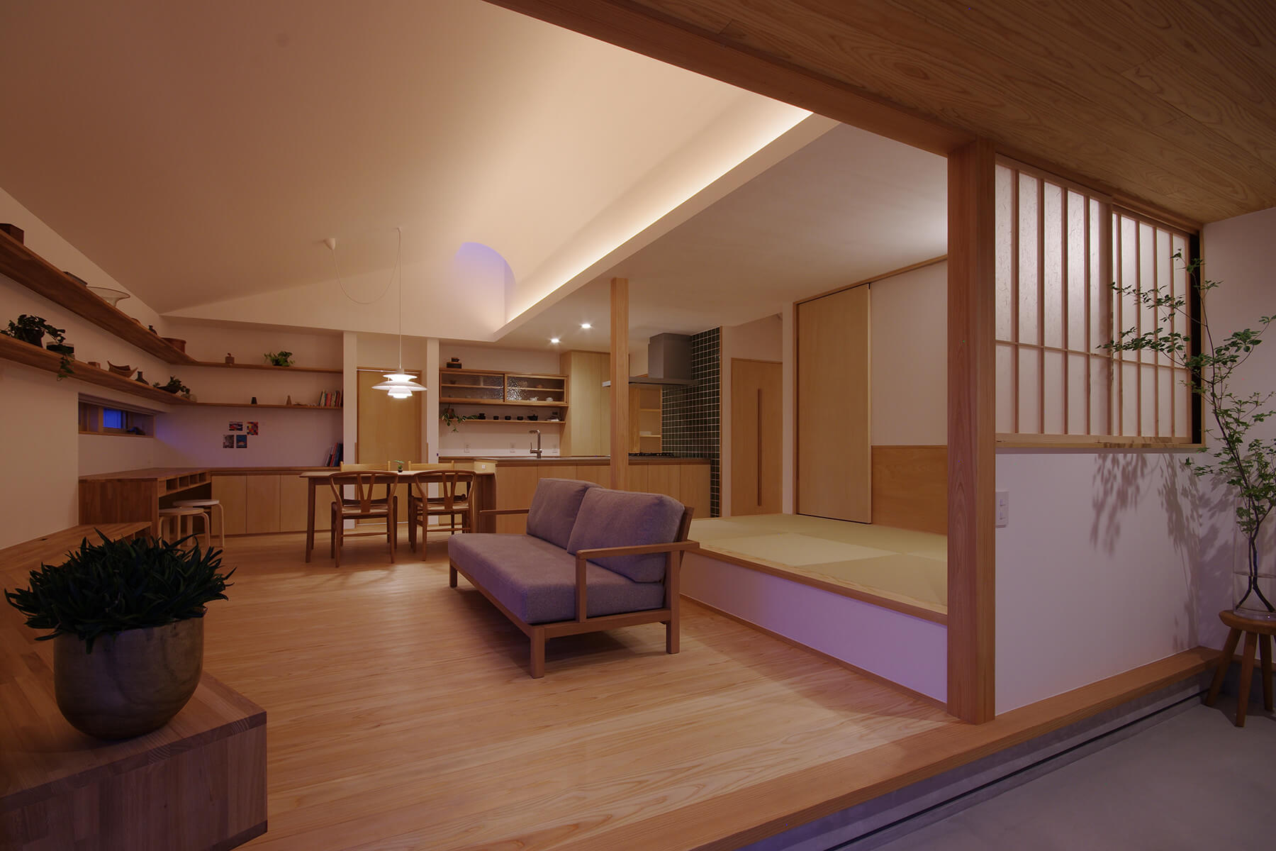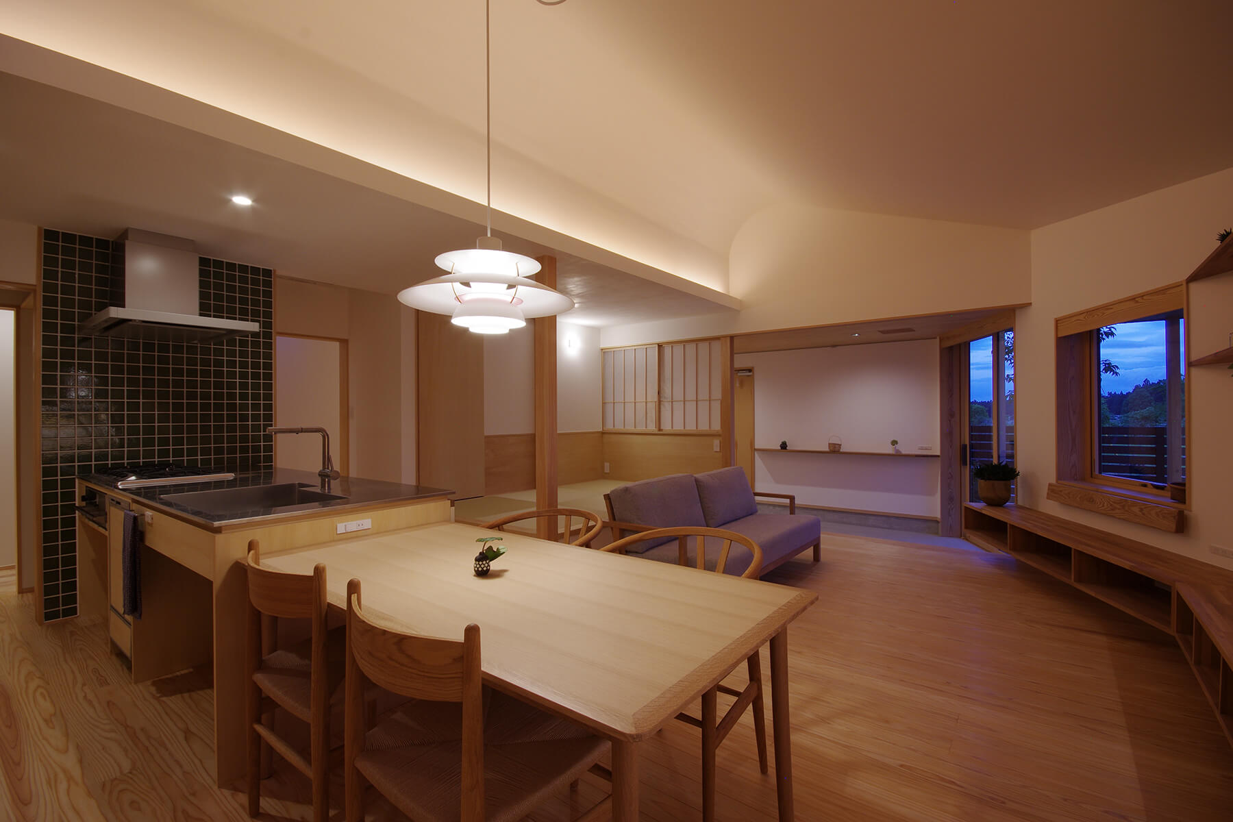 広い内土間から上がると気積が大きな空間が広がる。ここは生活のメインとなる場所でリビングのソファを含めて仕事や子供の宿題ができるスタディコーナー、庭を眺められる窓際のベンチ、昼寝ができる3帖の小上がりの和室など様々な居場所を設けて、家族が思い思いの場所で過ごせる仕掛けを用意した。また、天井と壁の接する部分を曲面にすることで柔らかく包まれる空間を作った。