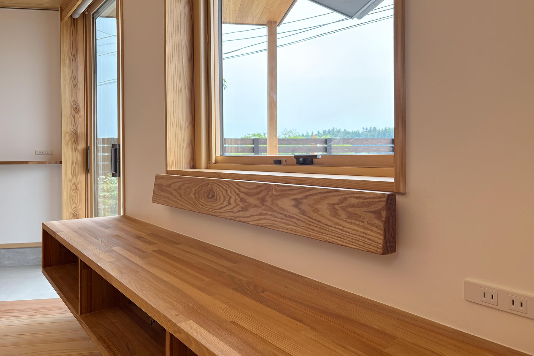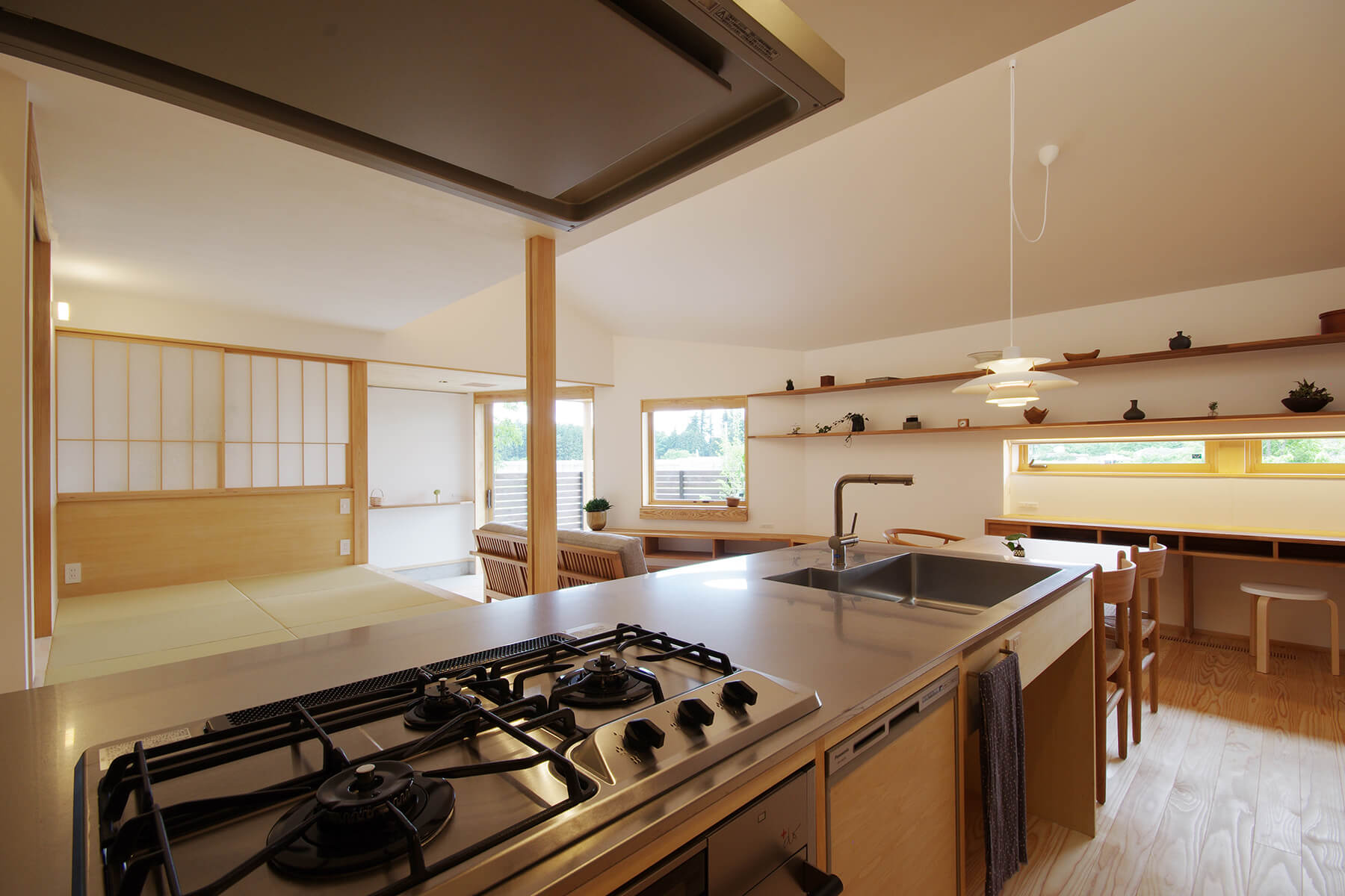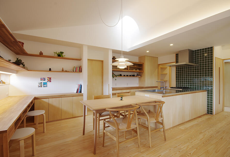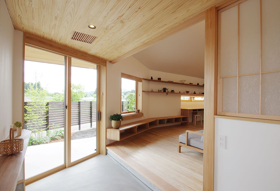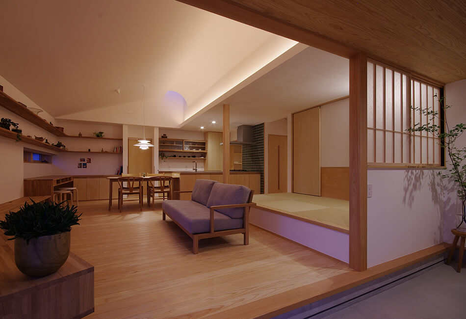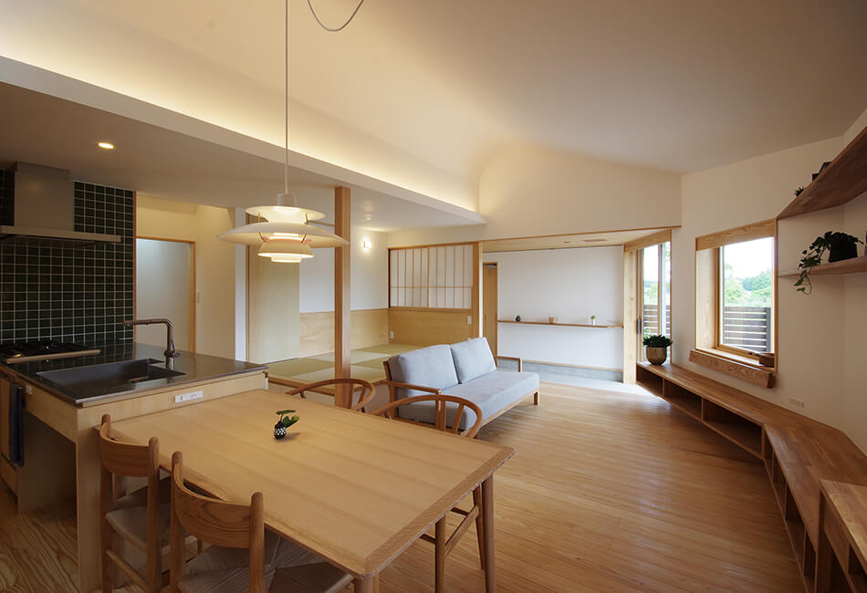 広い内土間から上がると気積が大きな空間が広がる。ここは生活のメインとなる場所でリビングのソファを含めて仕事や子供の宿題ができるスタディコーナー、庭を眺められる窓際のベンチ、昼寝ができる3帖の小上がりの和室など様々な居場所を設けて、家族が思い思いの場所で過ごせる仕掛けを用意した。また、天井と壁の接する部分を曲面にすることで柔らかく包まれる空間を作った。