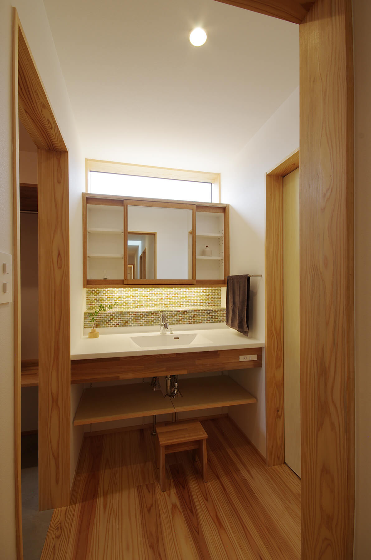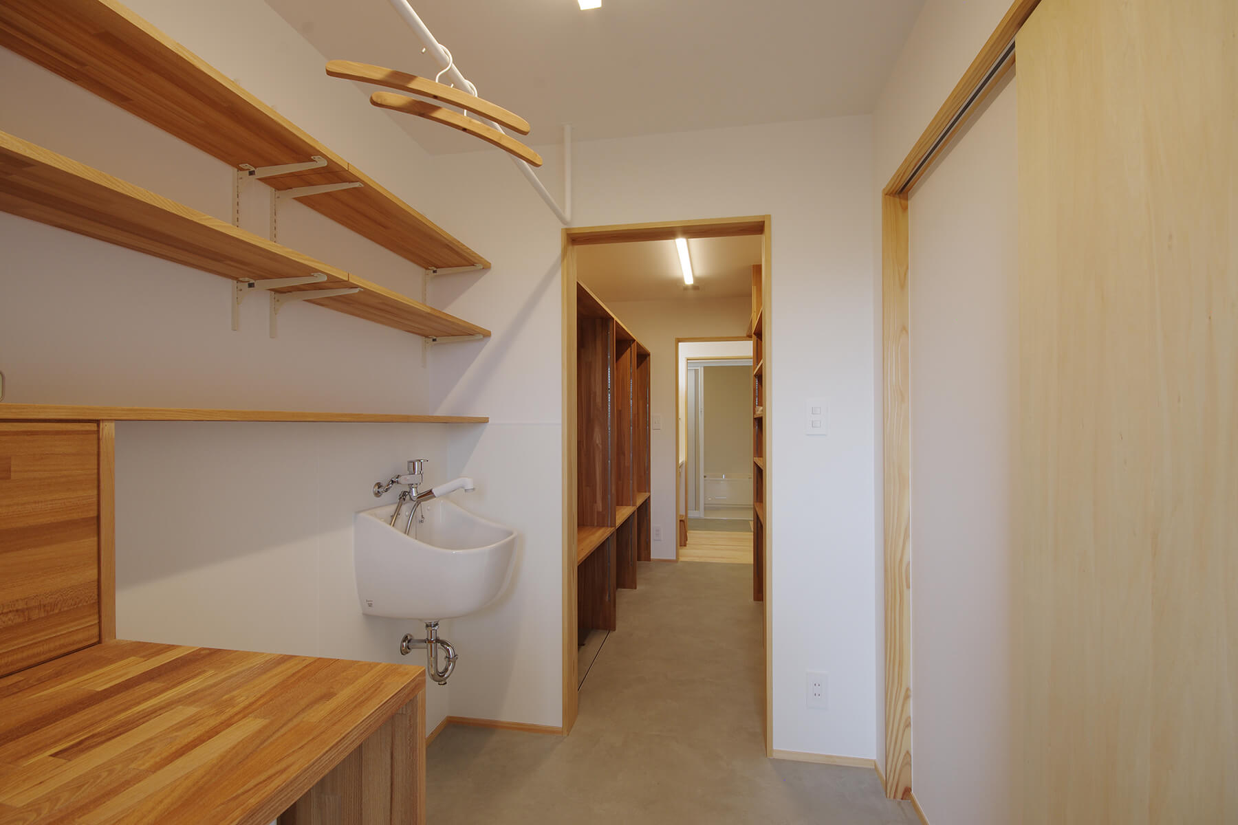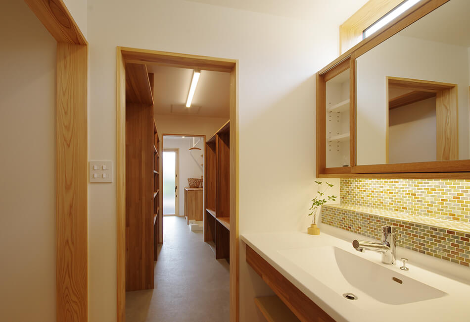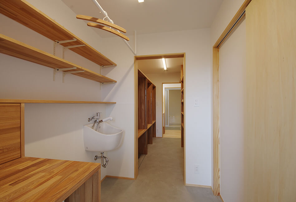 子供が小さく、これから洗濯物が増えていくことが予想されるので、洗濯などの家事動線は最短になるように計画し、日々のストレスが極力無くなるようなプランとした。