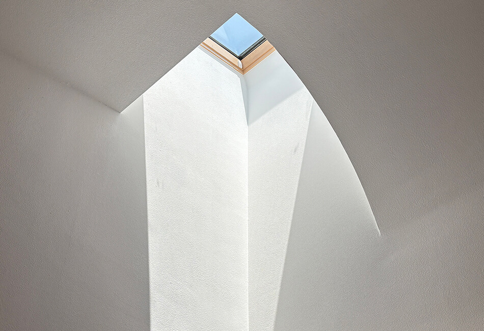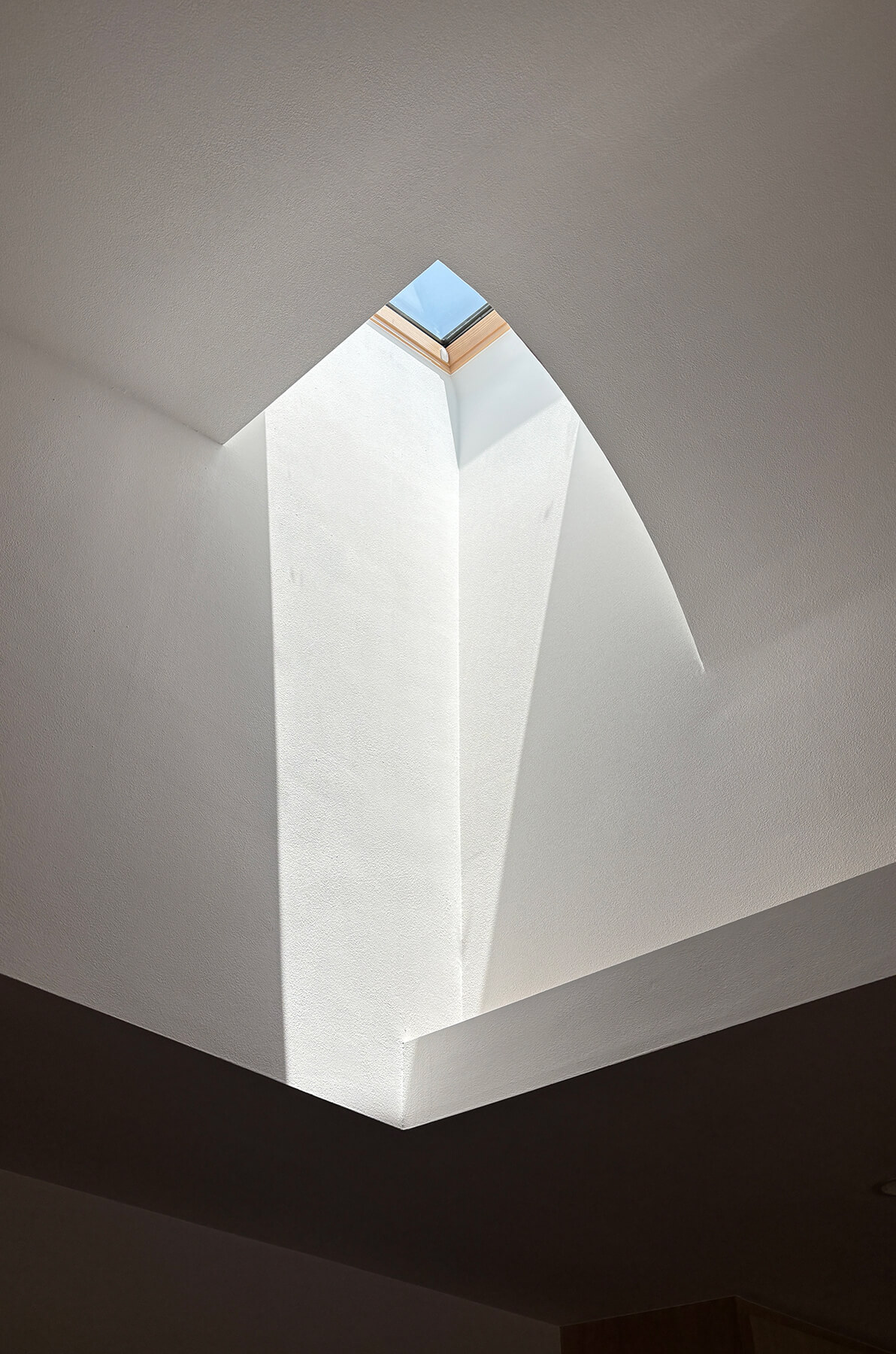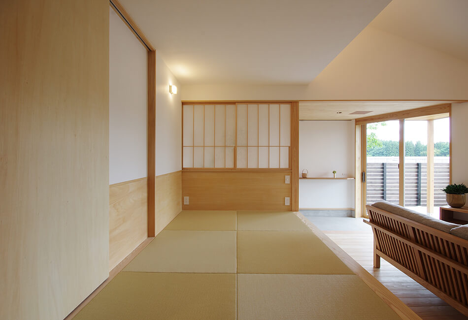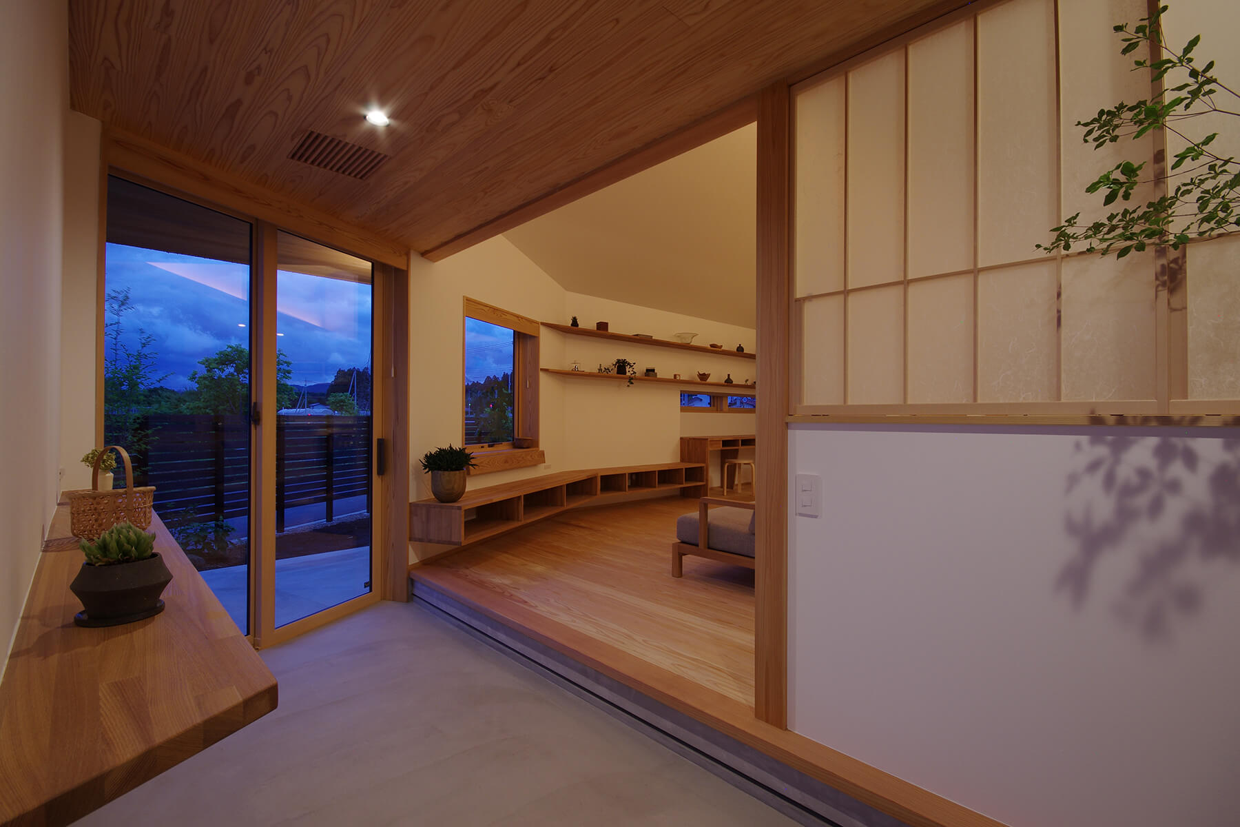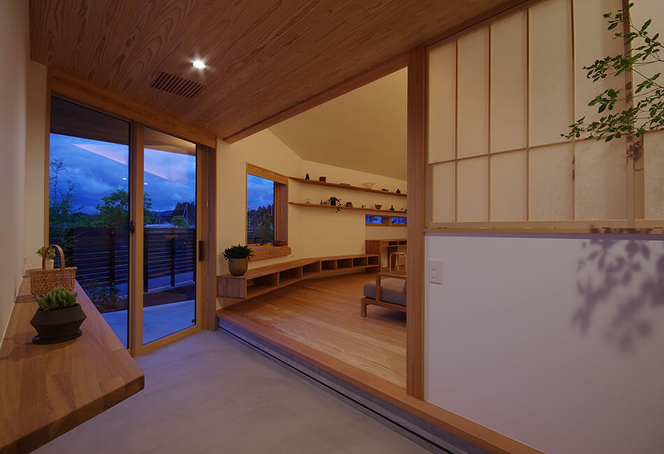真南が40°程度振れているので、建物の一部を隅切りし、その部分を南面させて光を取り込むようにした。また、隅切りをした外部を内土間から続くテラスとすることで内外を繋ぐ役割を持たせた。