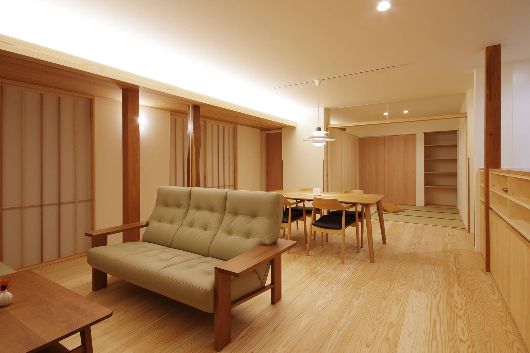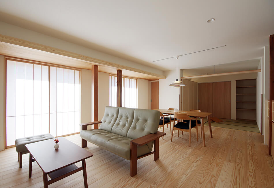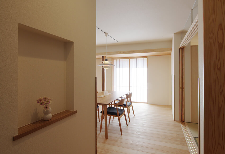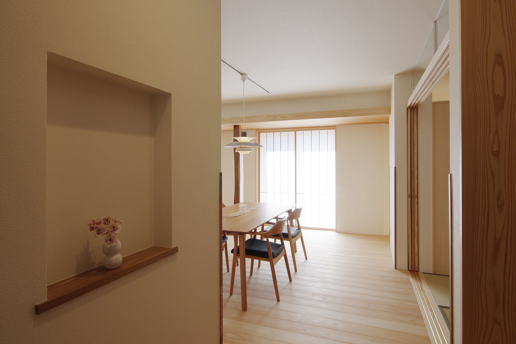 使用頻度が低く、床の間と押入で分かれていた2つの和室はリビングダイニングとし、常に人がいる場所に変換した。