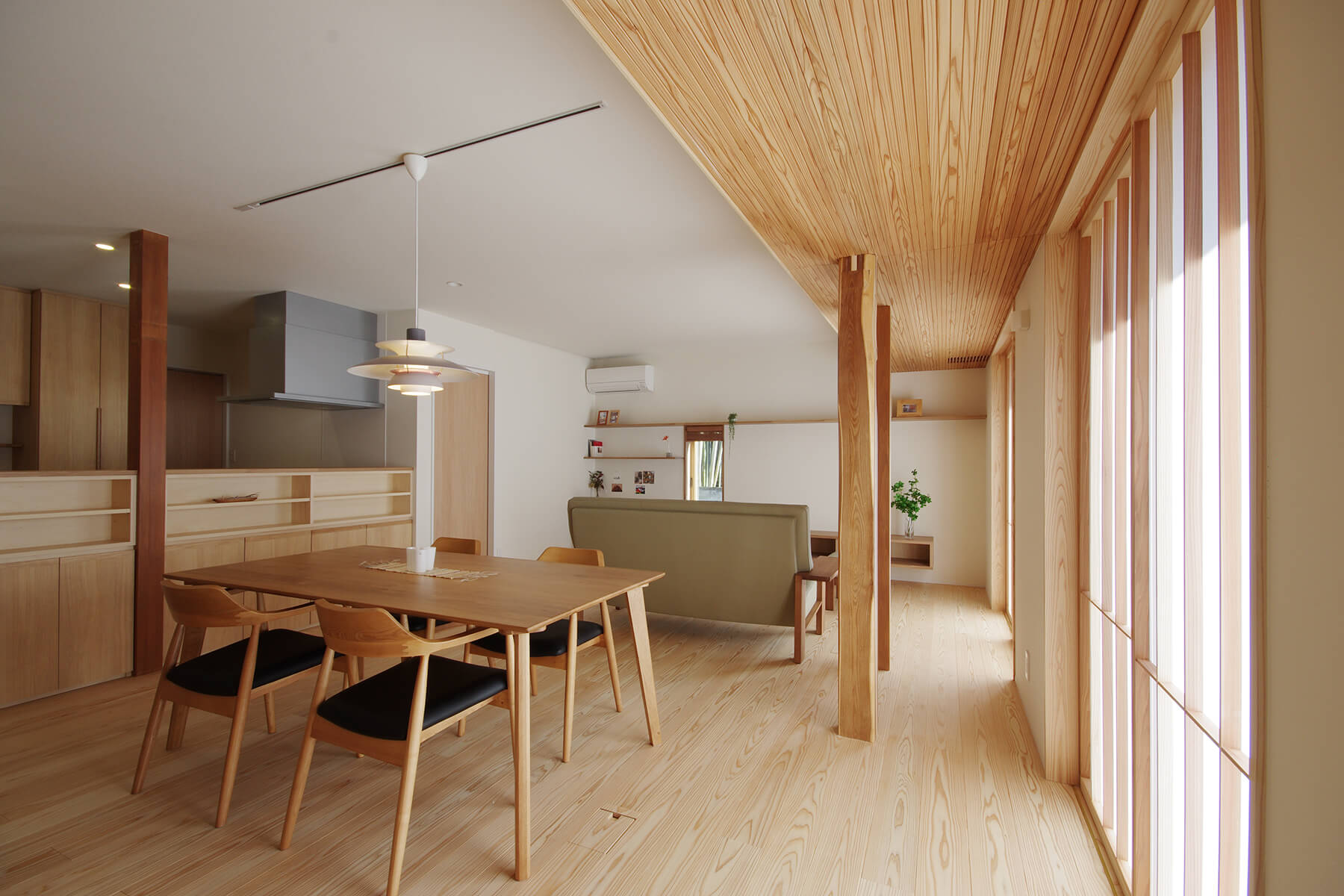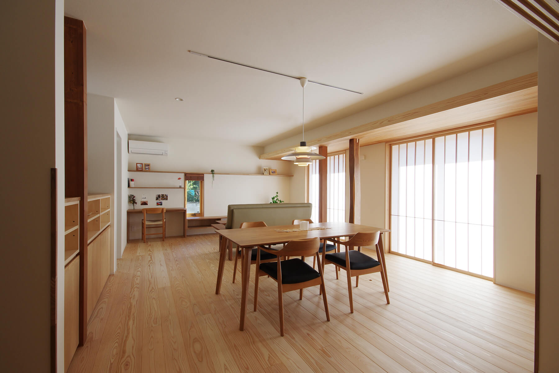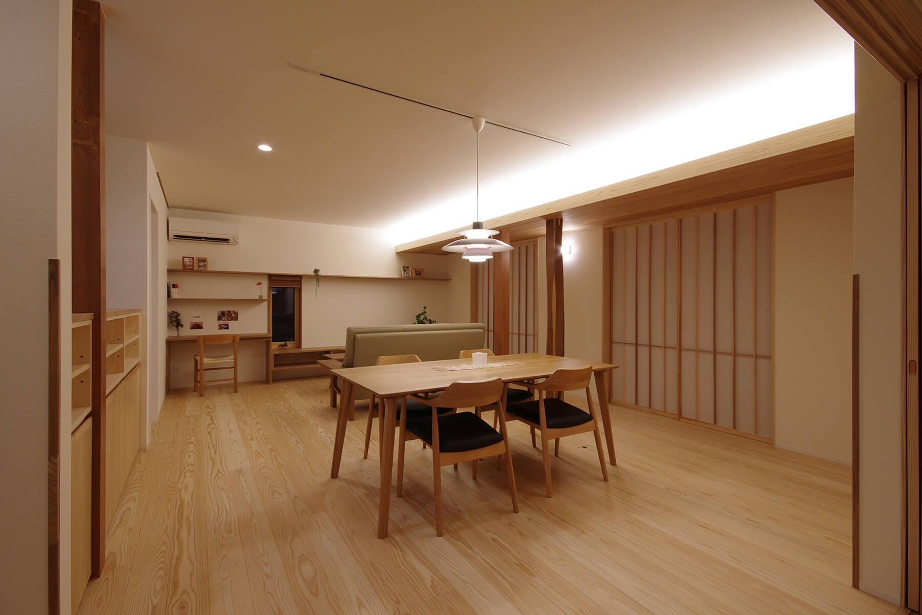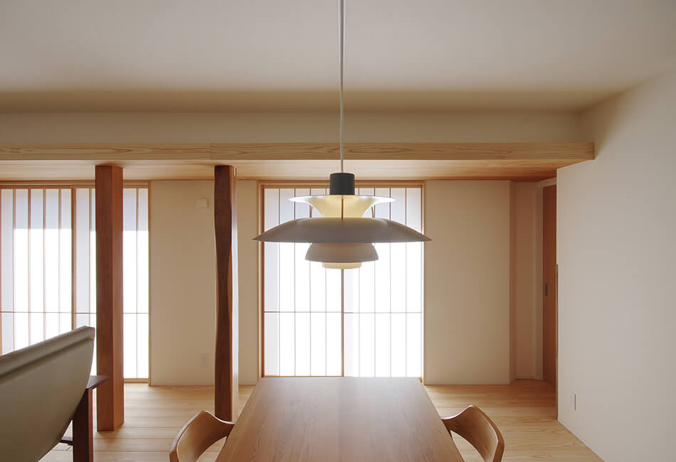 リビングダイニングの南側は天井を繊細な表情のリブ付き羽目板にすると同時に天井高さを約2.0mまで下げ、開口部には紙障子を設置することで落ち着いた窓辺空間を作った。