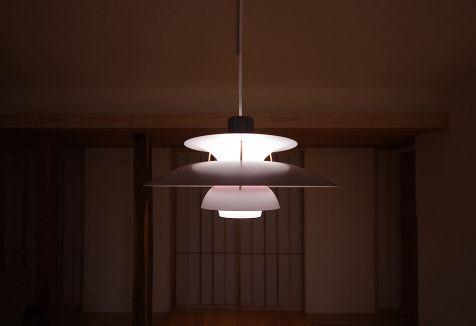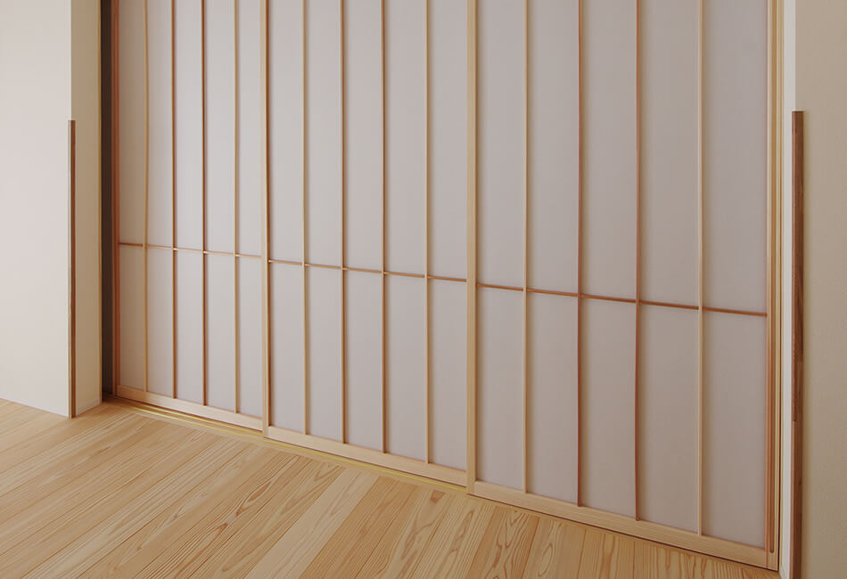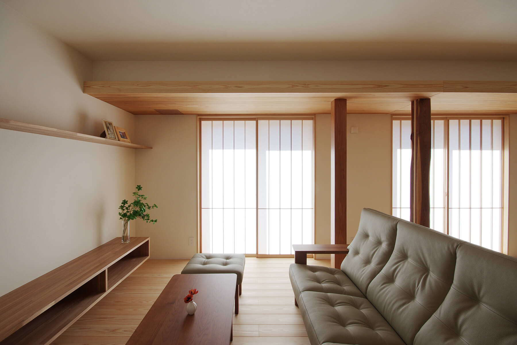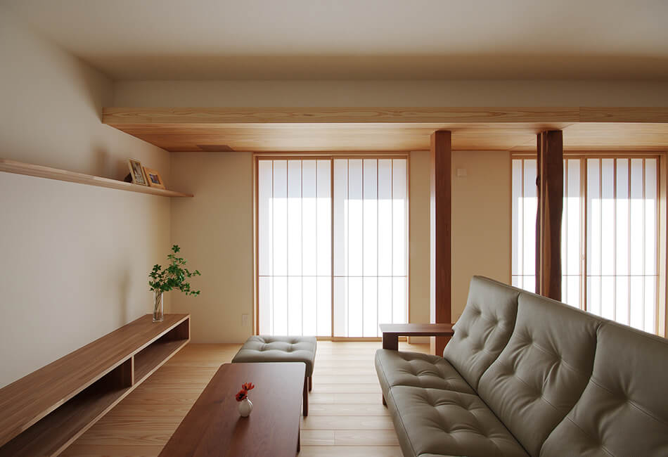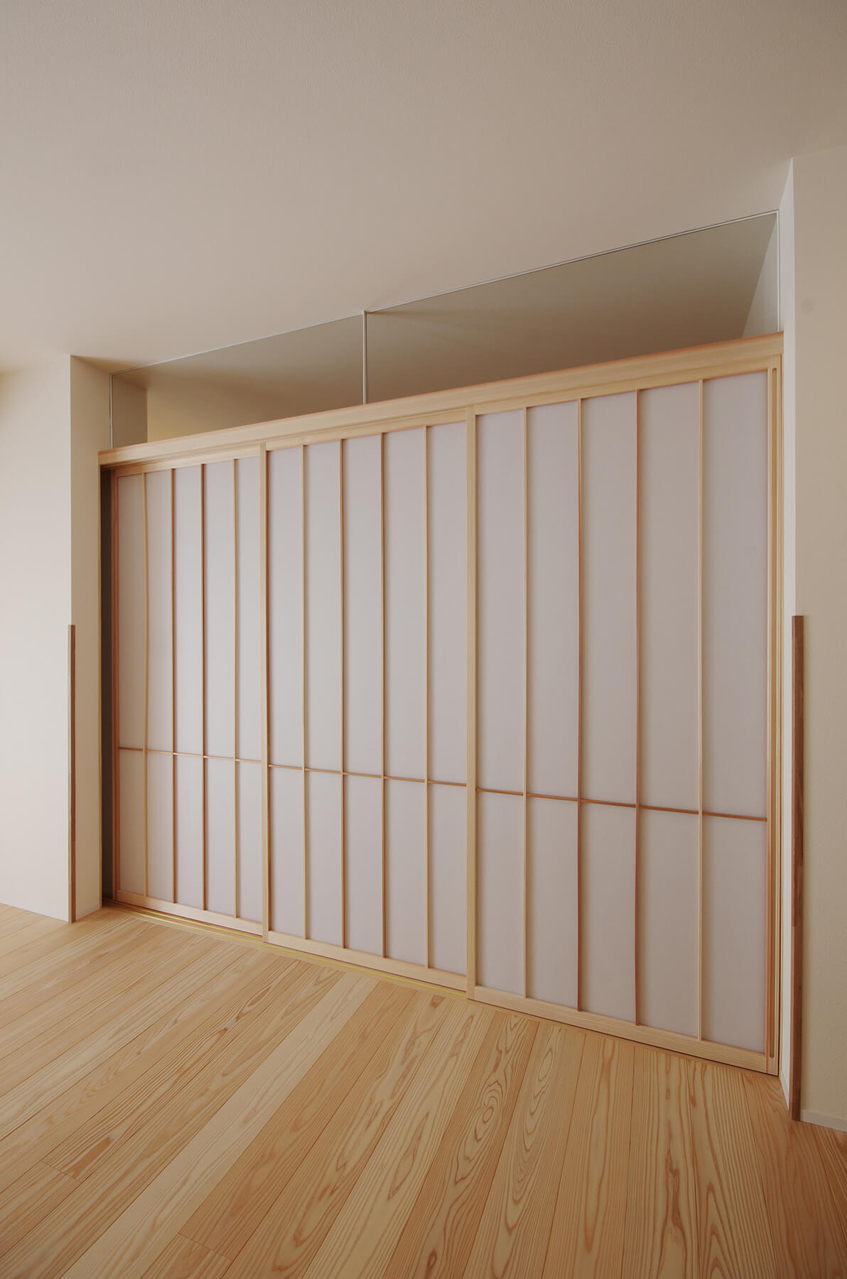リビングダイニングの南側は天井を繊細な表情のリブ付き羽目板にすると同時に天井高さを約2.0mまで下げ、開口部には紙障子を設置することで落ち着いた窓辺空間を作った。