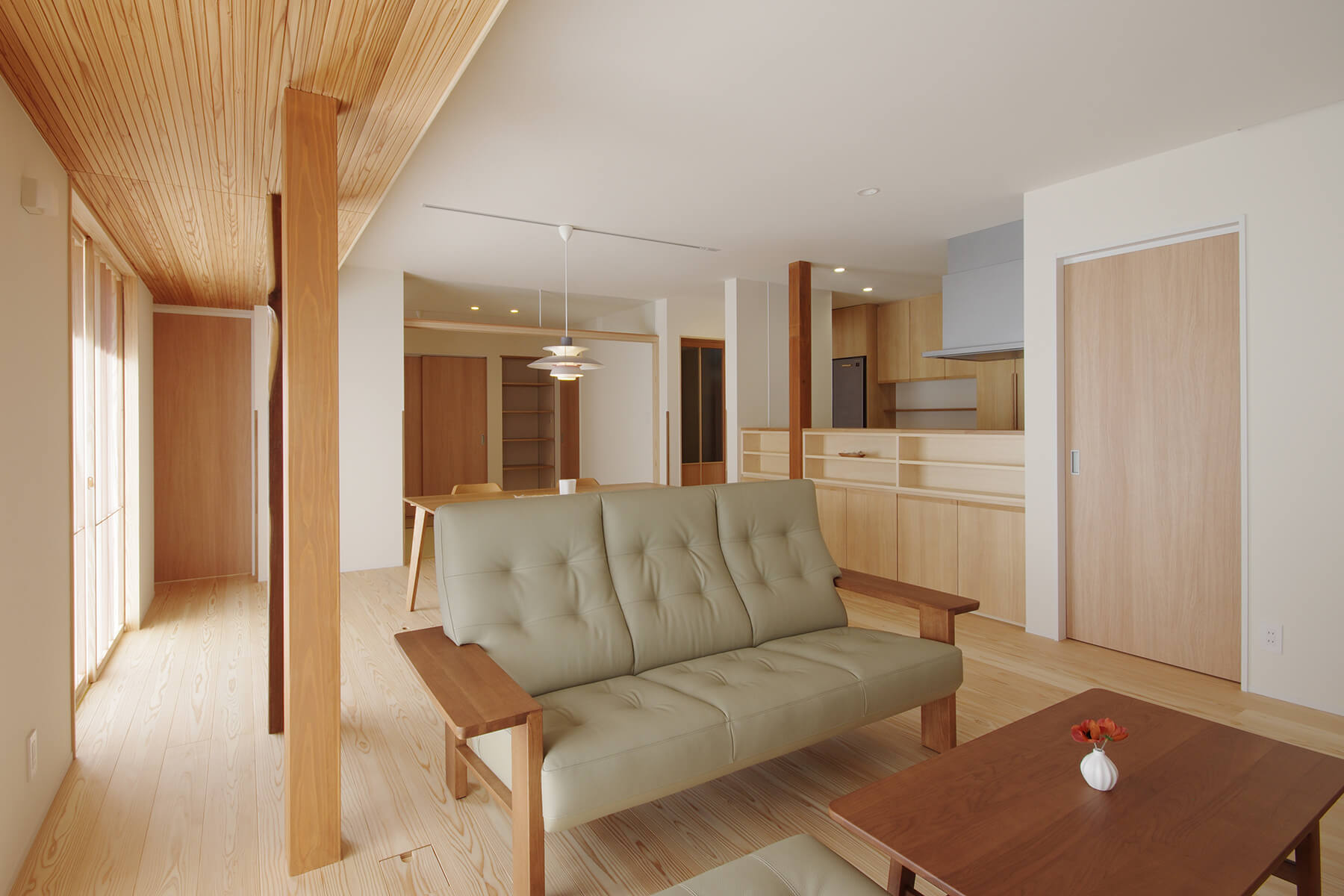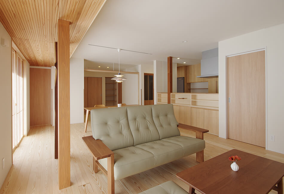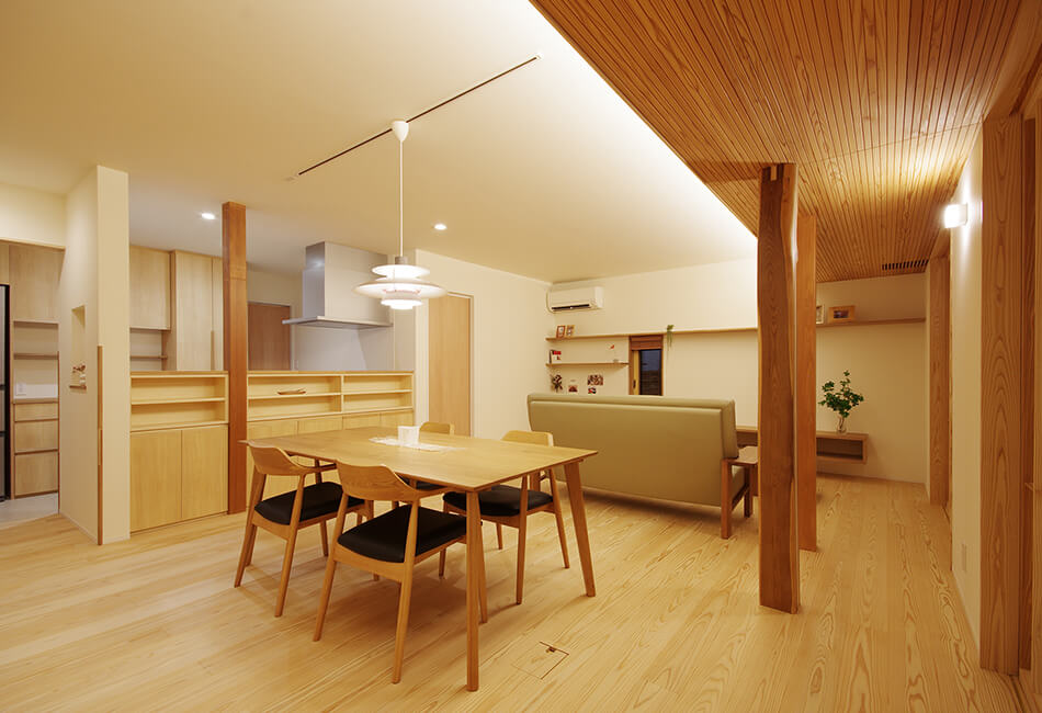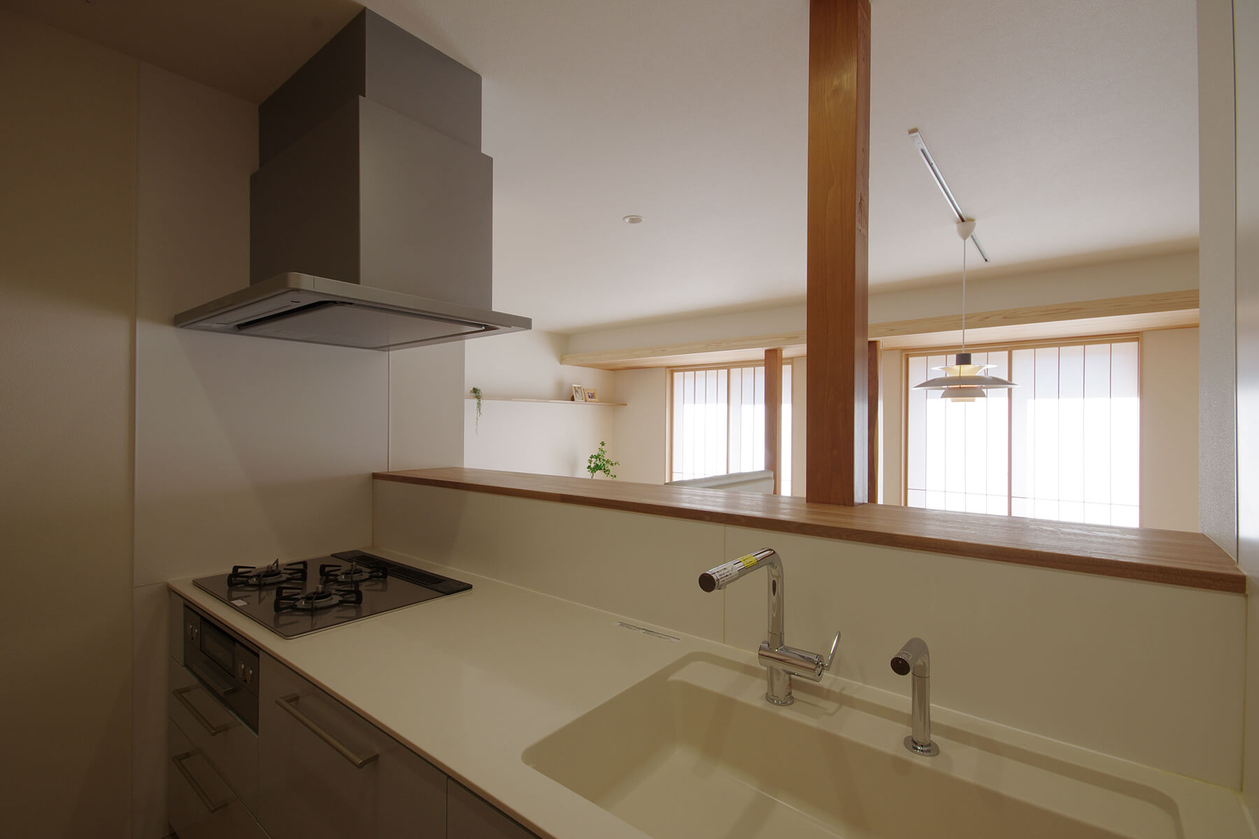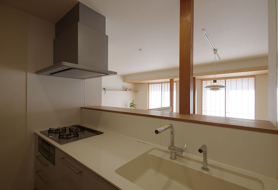 リビングとキッチンに現れる柱は既存のものであり、刻まれている傷の一つひとつは今までの生活を物語っている。そして、この柱はこれからのご夫婦の暮らしに寄り添っていくことであろう。