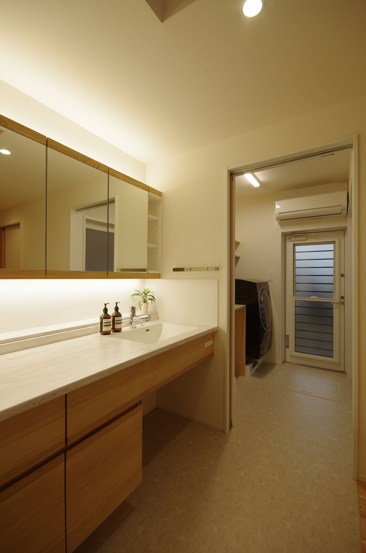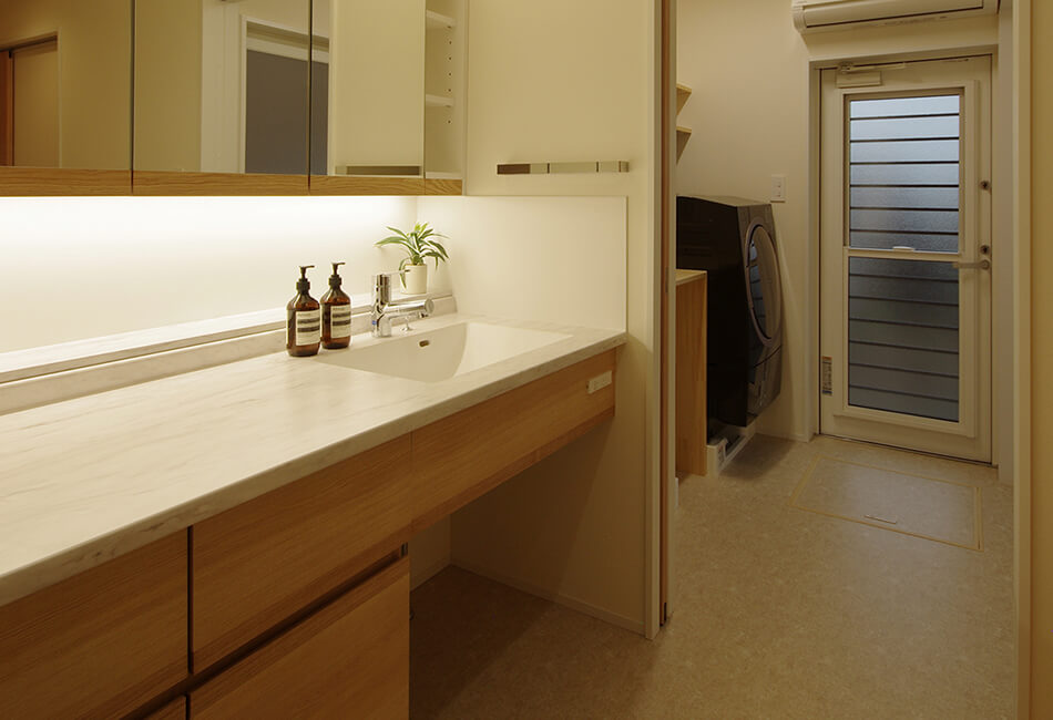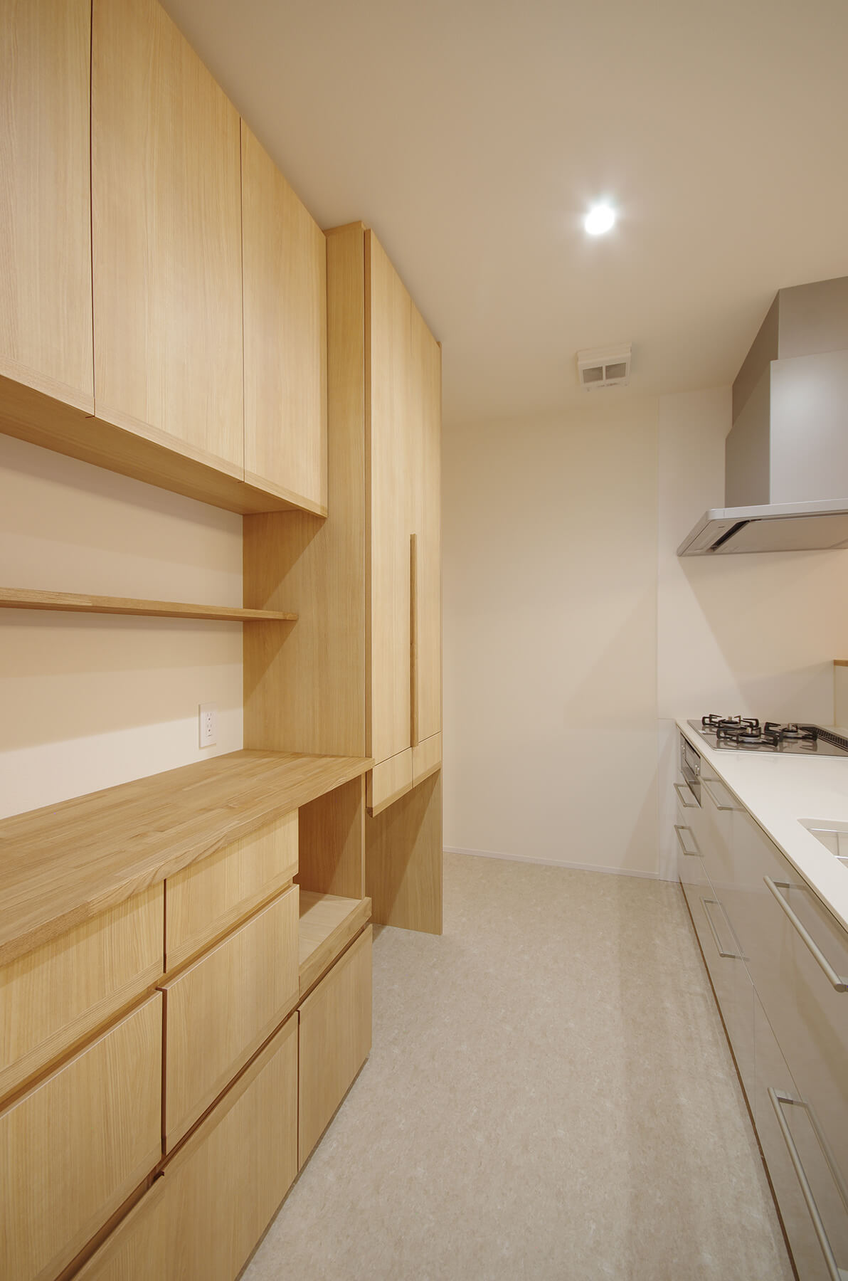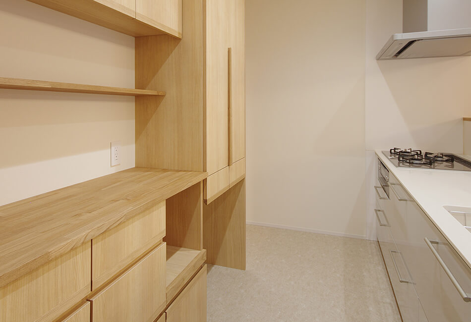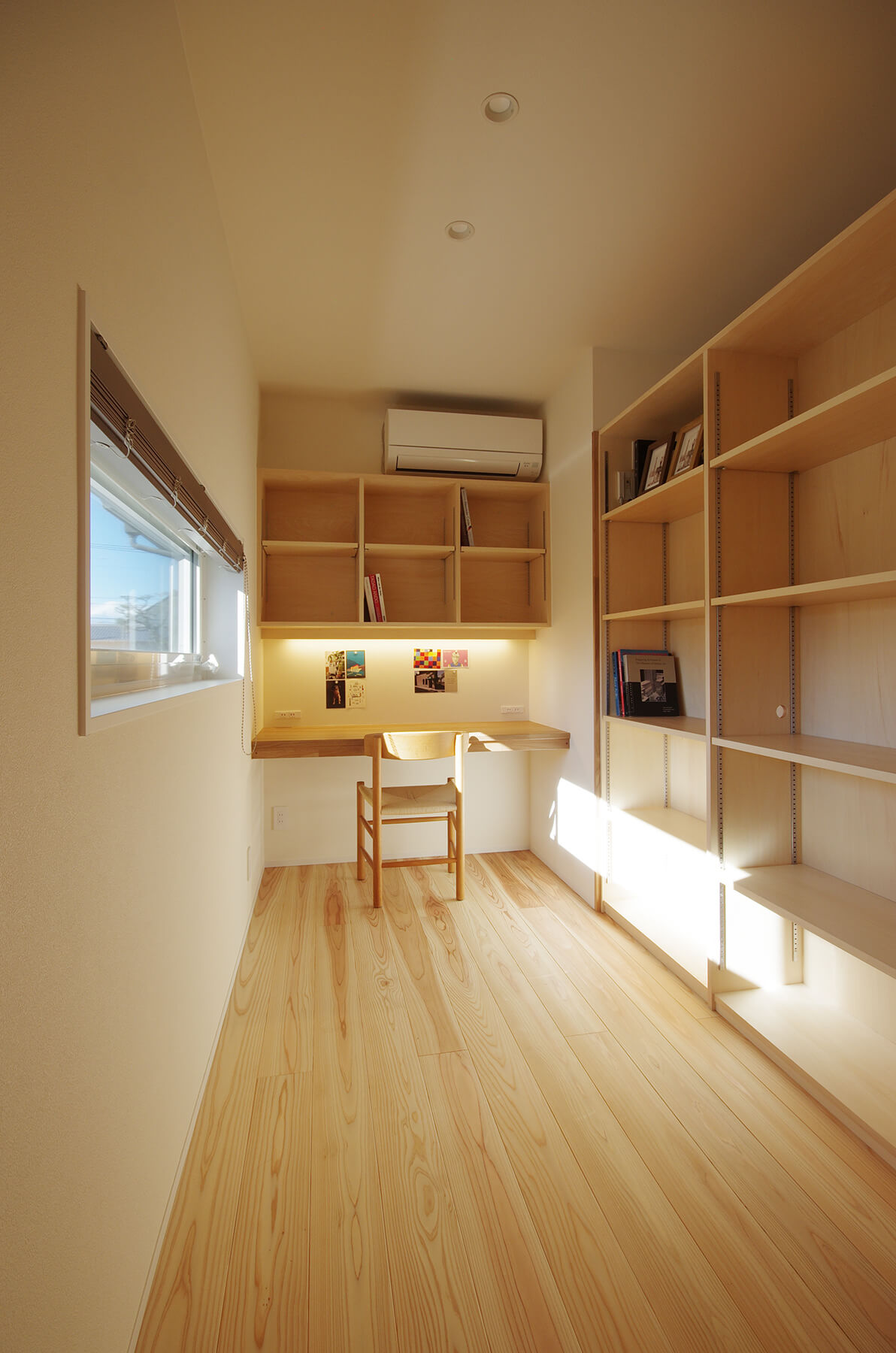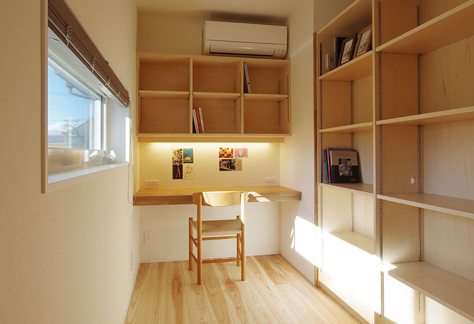 また、ご夫婦それぞれの居場所として、ご主人は篭れる個室を、ご婦人はリビングの脇のスペースを、それぞれ造り付けカウンターを設置した。